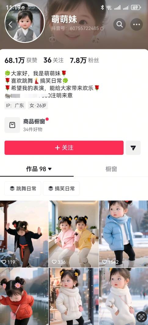 比如这个号,只发了98个作品就涨粉7.8万,所有内容都是AI生成的,要么是萌宝跳舞,要么是搞笑段子,形式简单却很讨喜。