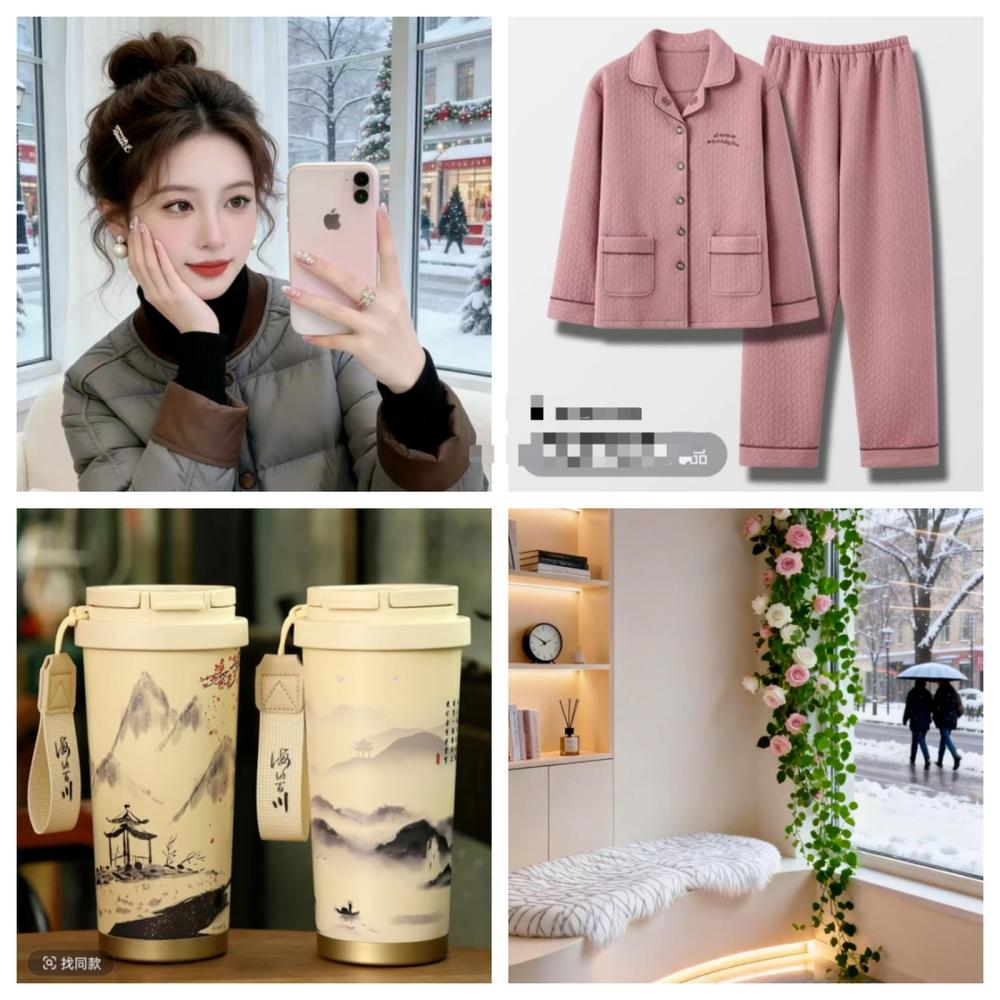 我准备了四张图做演示:一张美女图、一件衣服图、一个水杯图,还有一张带毛绒坐垫的窗边背景图。我的需求很明确:让美女穿上指定衣服,拿着水杯坐在坐垫上,对着镜头介绍水杯功能。