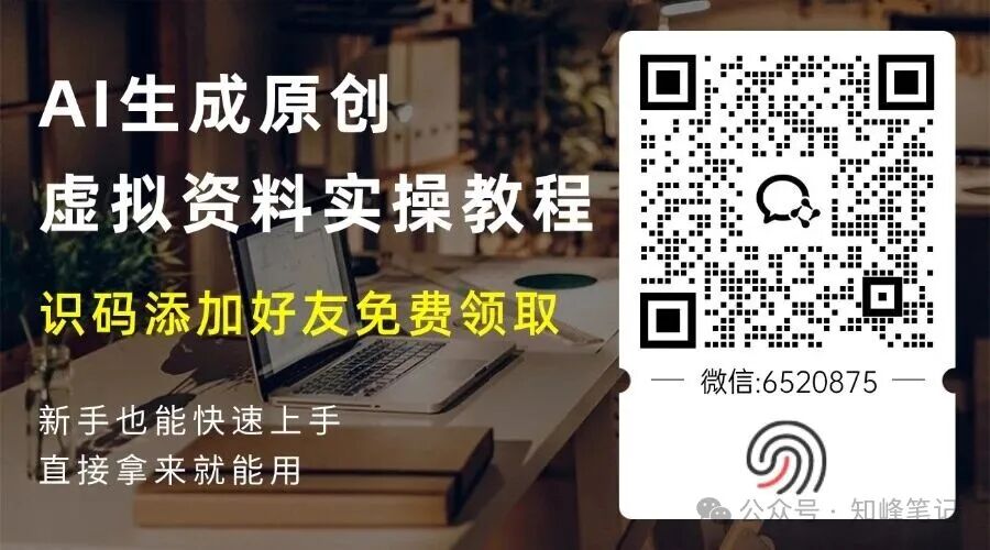 我是知峰,专注虚拟资料变现,持续分享虚拟资料玩法,案例,不方便公开发的玩法、工具、案例,都在微信朋友圈更新,添加好友,送你一份AI生成原创虚拟资料操作玩法教程。