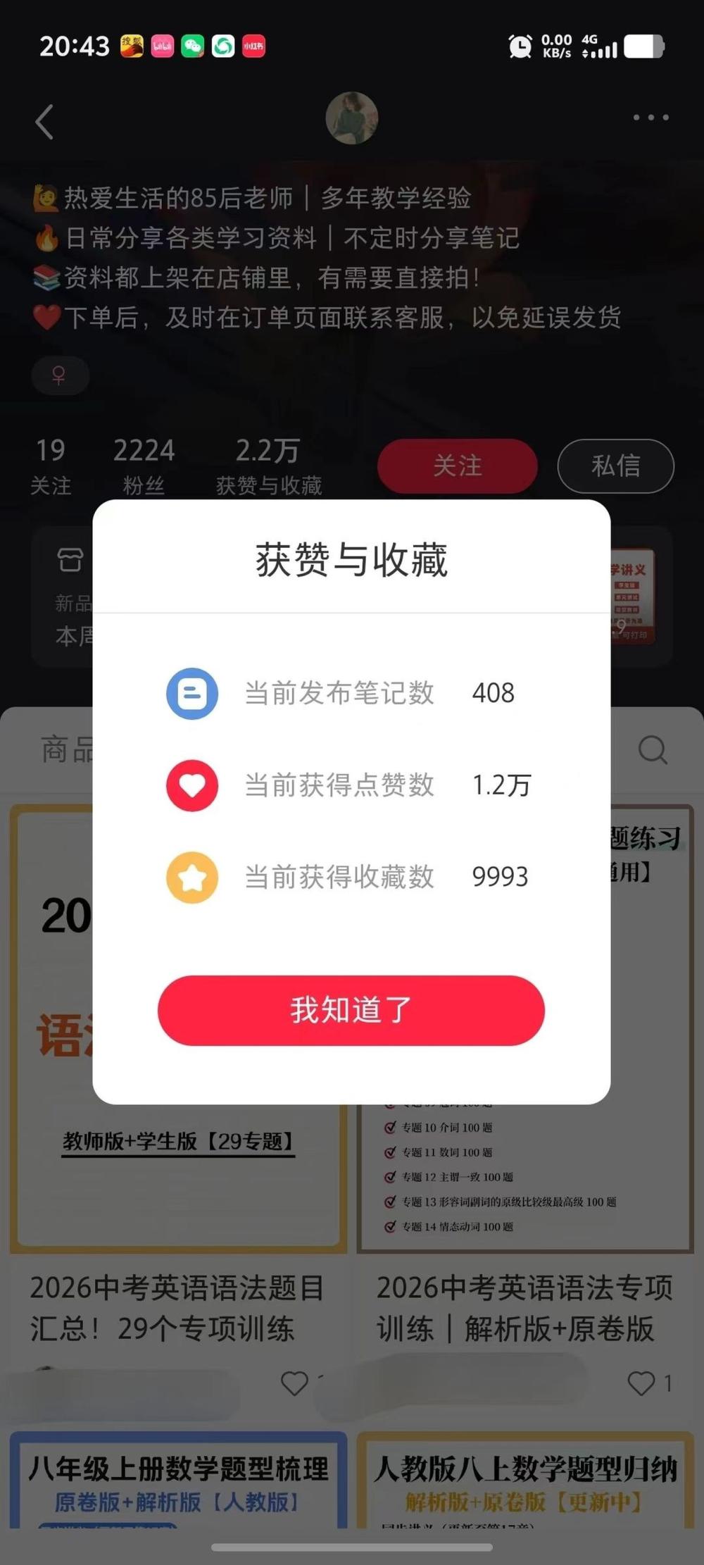 为什么选这个?因为家长的焦虑是无止境的,而且是可以被量化的。我在小红书上盯到了一个账号,这个博主做了8个月,只卖初中各科的复习讲义。