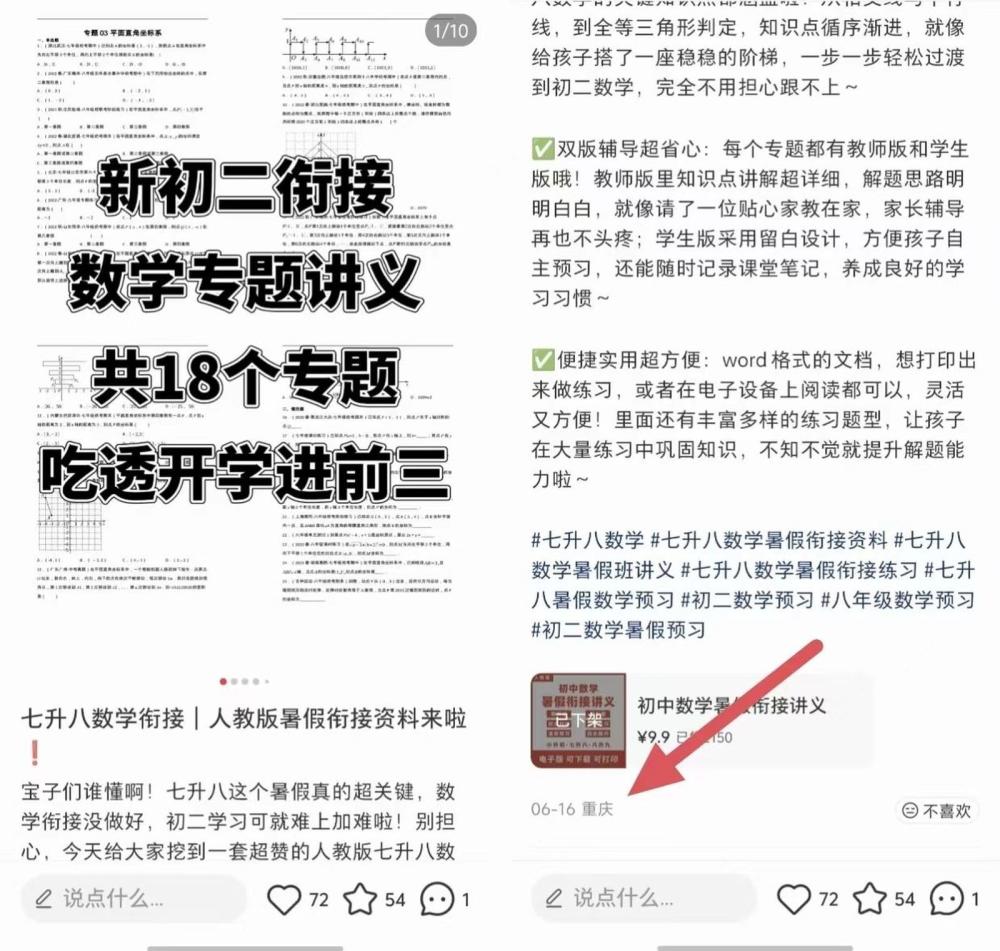 这个博主就是在6月中旬,疯狂铺设关于“初一升初二衔接”、“暑假逆袭计划”的笔记。当时发出来可能数据一般,只有几十个赞。