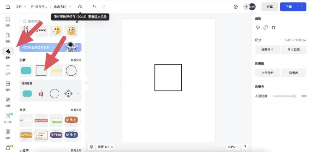 首先,画布比例选3:4,这是小红书最友好的尺寸。然后,去素材库里拉一个方框,把画布圈起来。